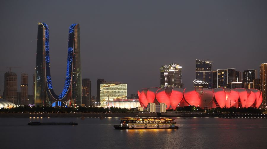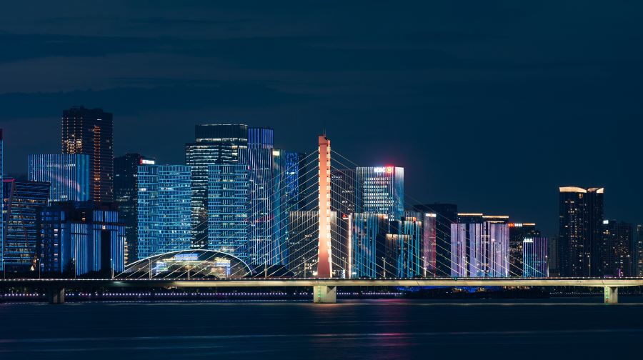 从武林门码头出发,游船沿着钱塘江缓缓行驶,游客可以在甲板上享受江风的轻拂,观赏沿途的风景。两岸的建筑在灯光的映衬下显得格外迷人,尤其是经过城市地标时,游客可以看到杭州的繁华夜景与江水的宁静交相辉映。