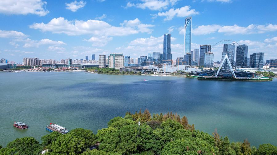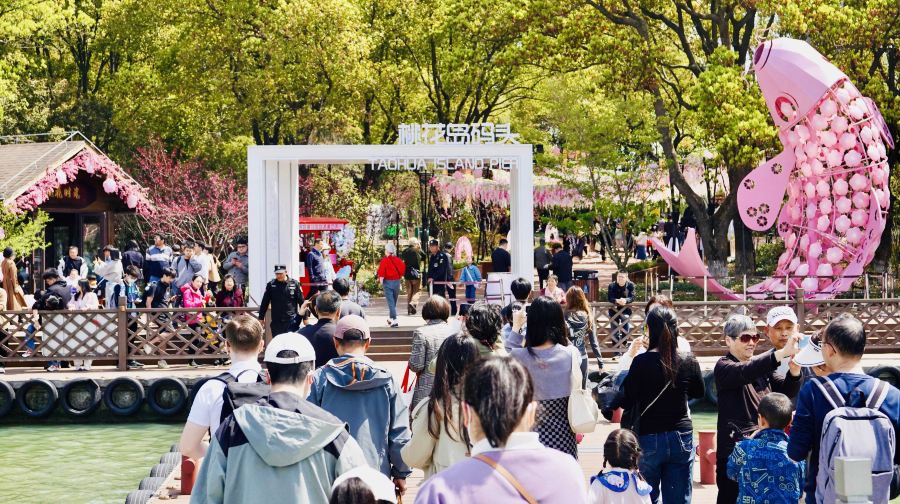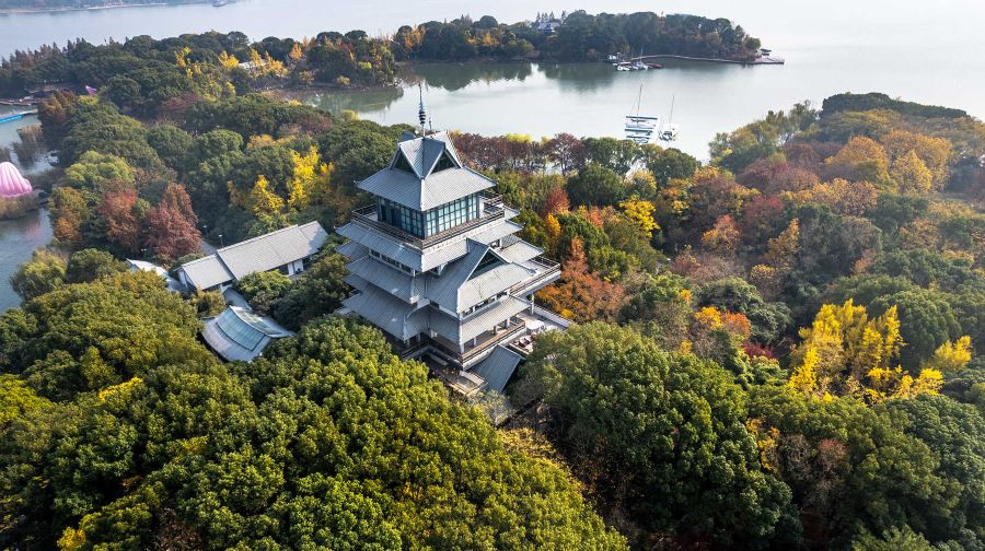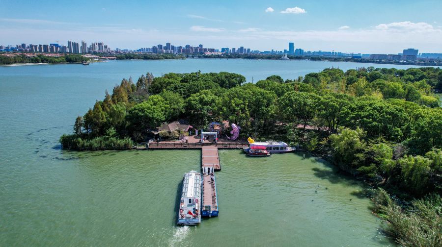 桃花岛位于苏州金鸡湖景区湖心。金鸡湖桃花岛不同于浙江舟山的桃花岛,只是同名。金鸡湖桃花岛占地面积10公顷,约150亩。在桃花盛开的季节,岛上桃花斗艳,桃花占总植被量的百分之五十。桃花岛上有两处景观建筑,其中一处是金鸡湖中的标志性建筑——“紫氤阁”。“紫氤阁”,源于紫气东来。登高远眺,一湖风光尽收眼底。另一处桃花源茶室为古典的建筑风格和新中式装修风格相结合,临水品茗何等惬意。