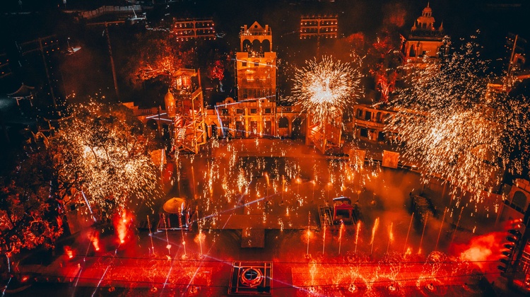非遗铁花秀,由华侨青年和岭南建筑师傅间的互动剧情切入,以光影与花火交错,诠释“千锤百炼”之深意 展现中国人精益求精、推陈出新的匠人精神,更通过多种“火”表演展现中华传统演艺的热烈与璀璨。