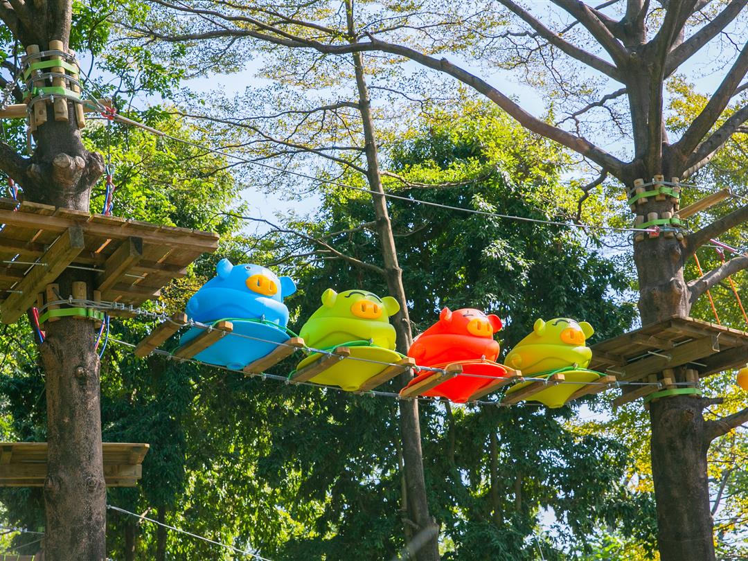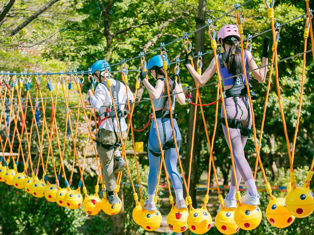 身高1.3米以上可体验,20个关卡兼顾挑战性与娱乐性,堪称乐园“人气王”。压轴环节8米高丛林大秋千,纵身跃下后随绳索向30米外织网摇荡,沉浸式感受人猿泰山般的失重快感,肾上腺素直接拉满!