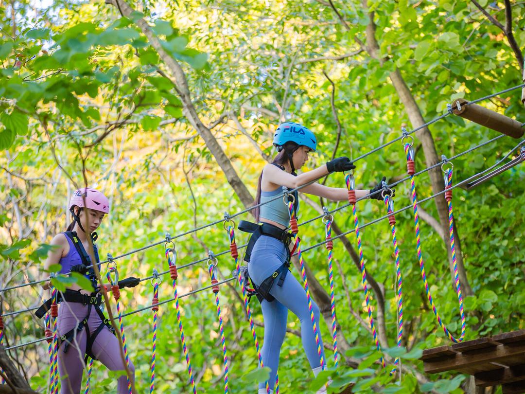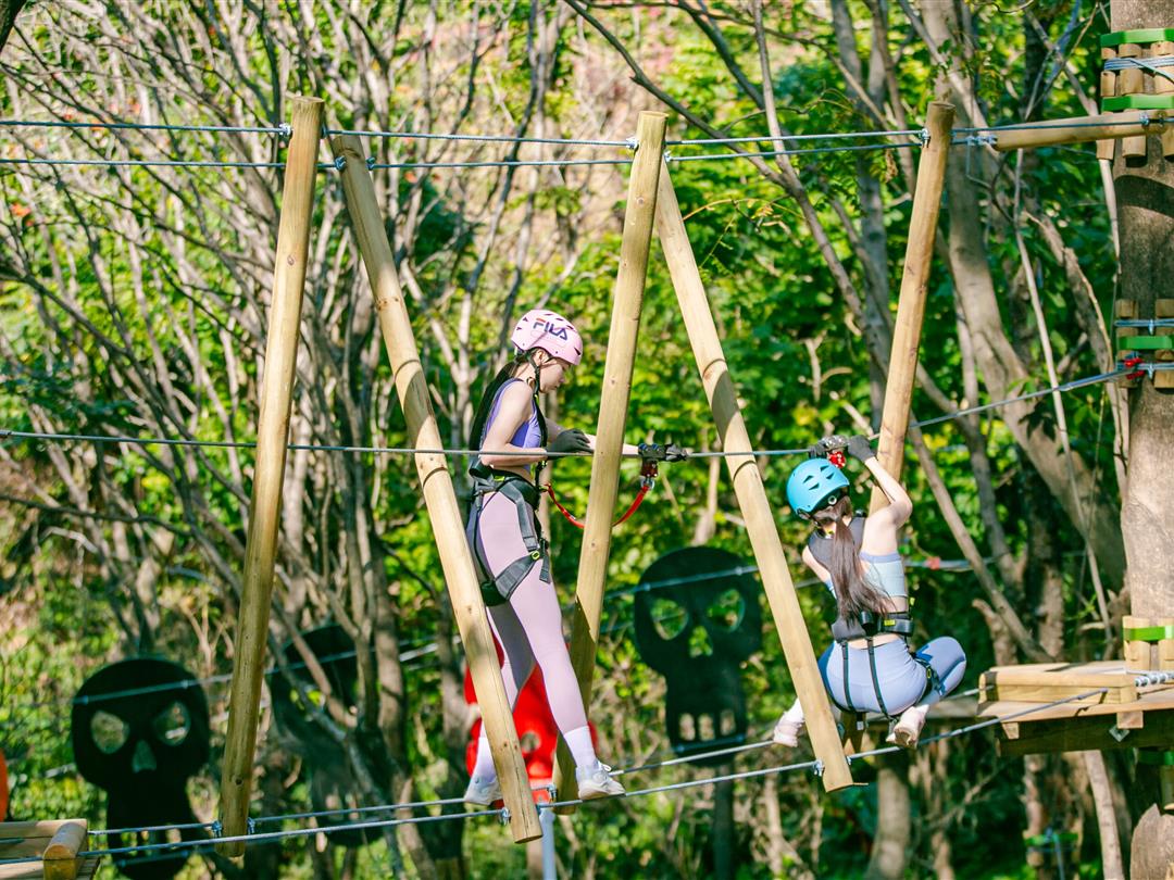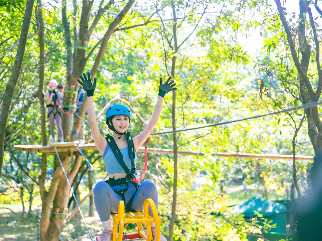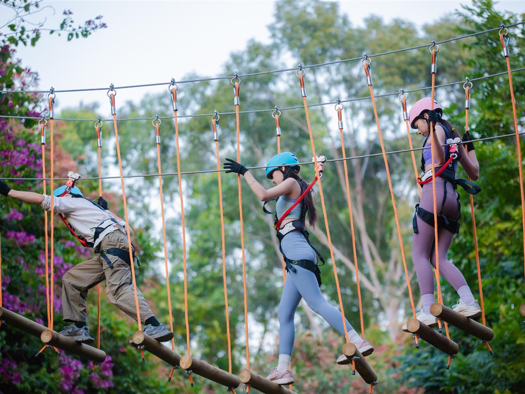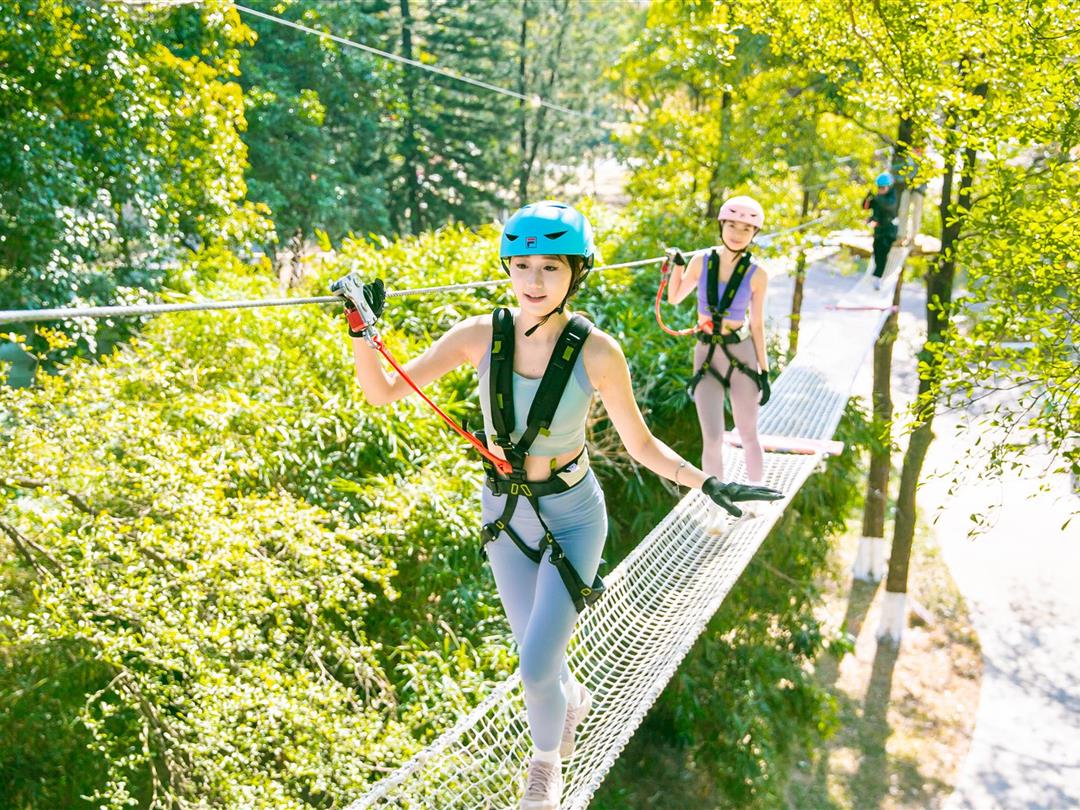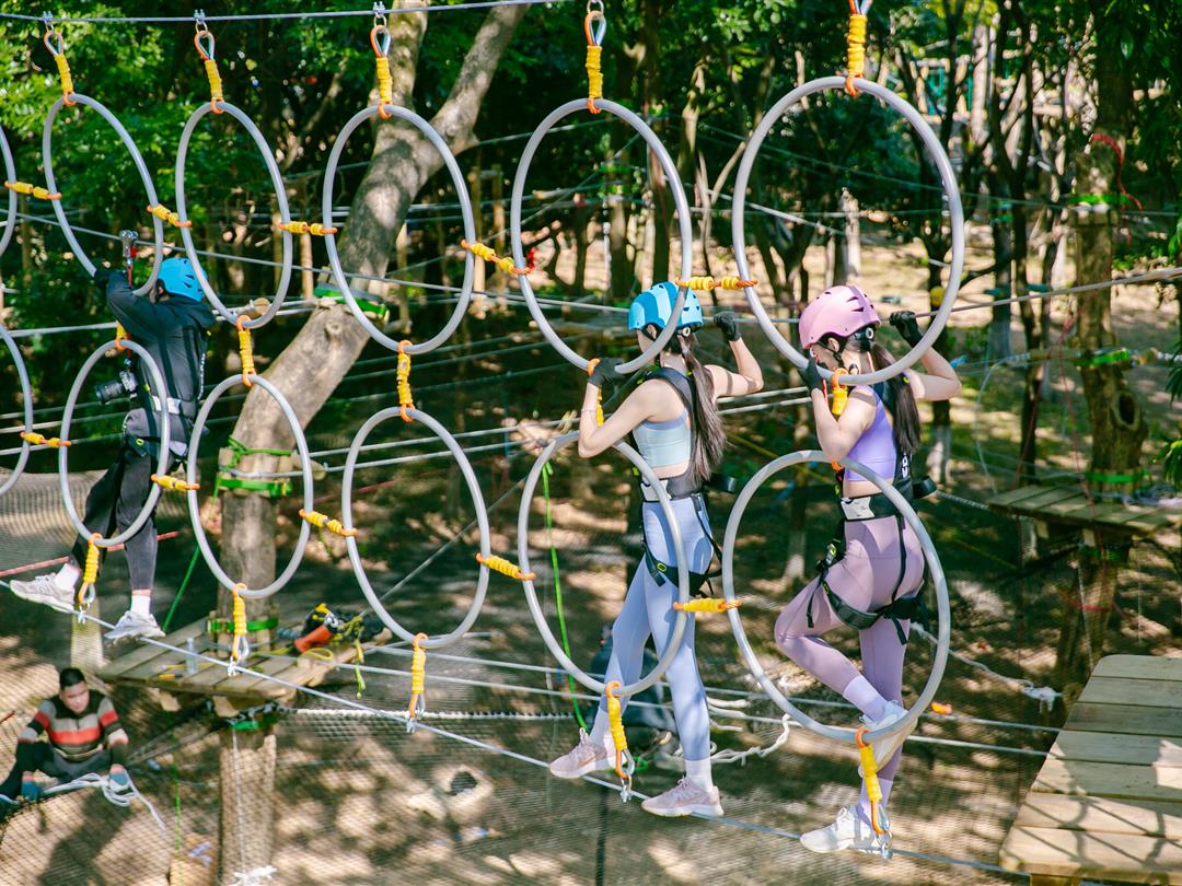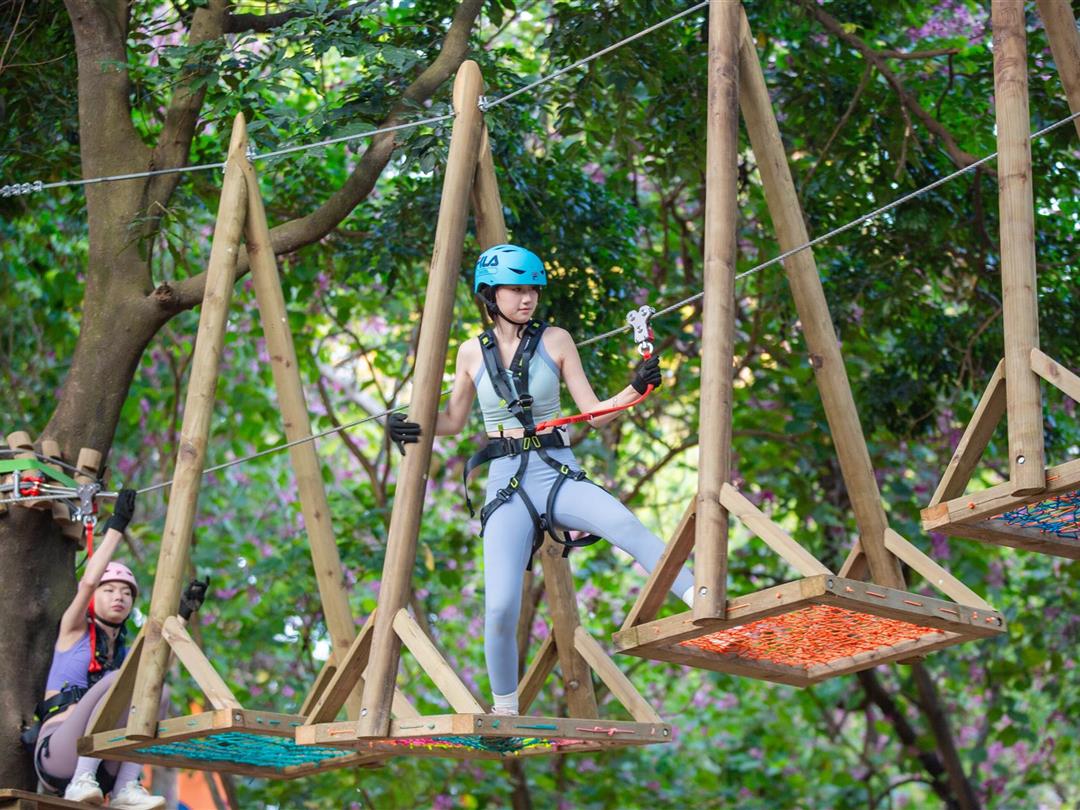 身高1.2米以上可体验,20个关卡难度适中,适配想尝试轻度挑战又不愿过度耗力的游客。标志性空中秋千让你悬浮于丛林之上,微风拂面间仿佛置身云端,悠哉享受空中漫步的惬意。