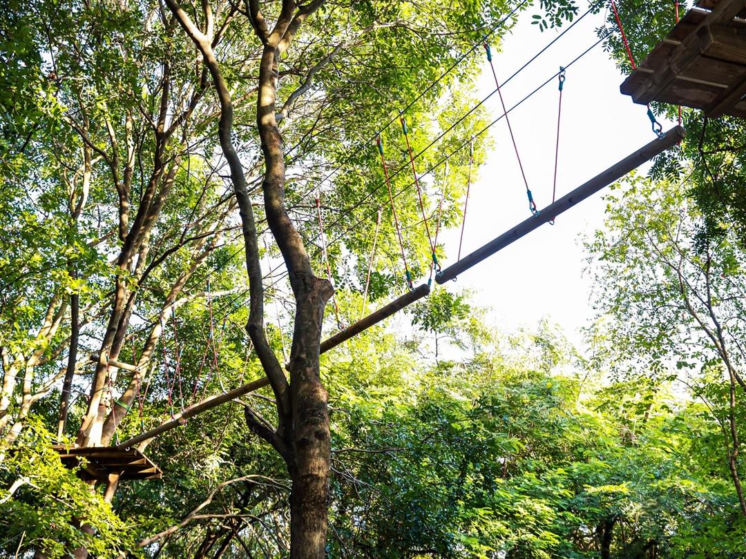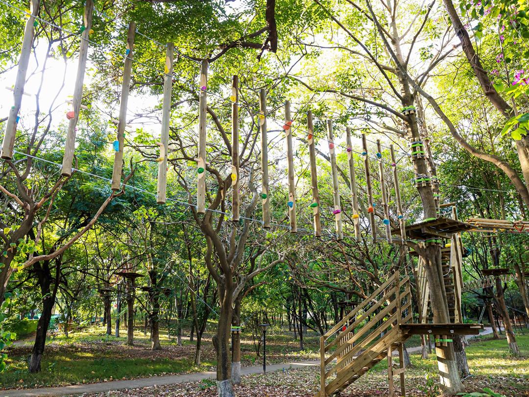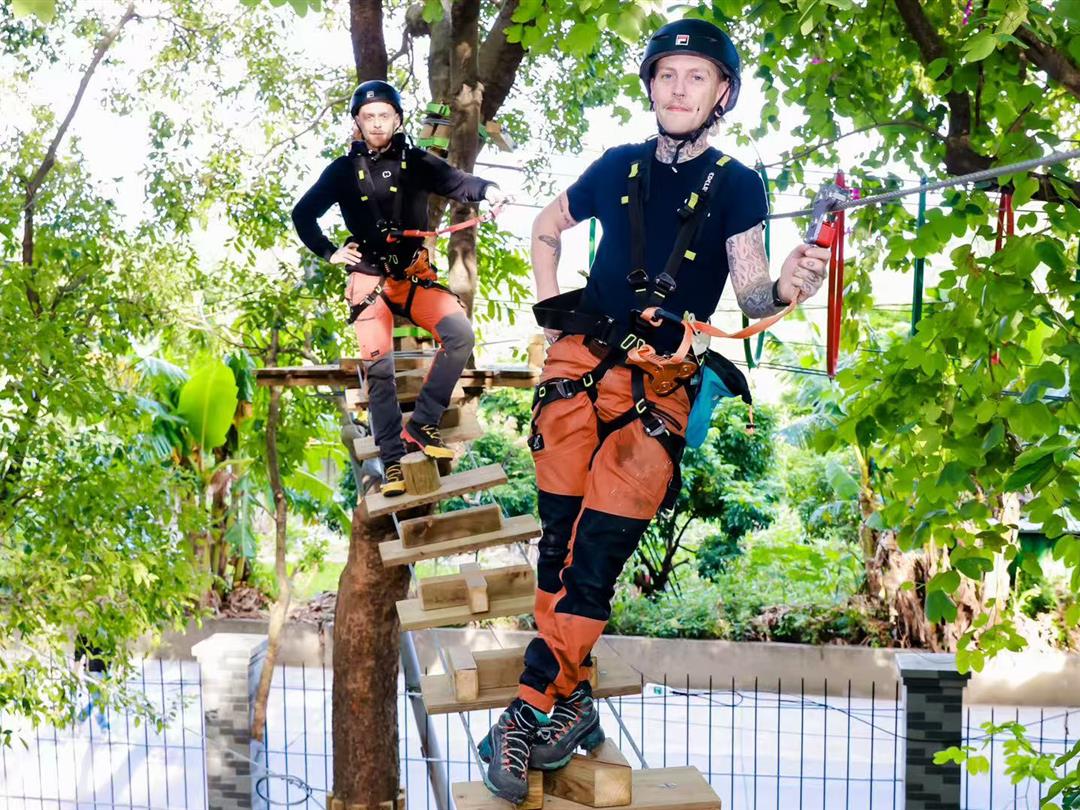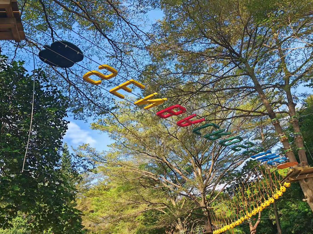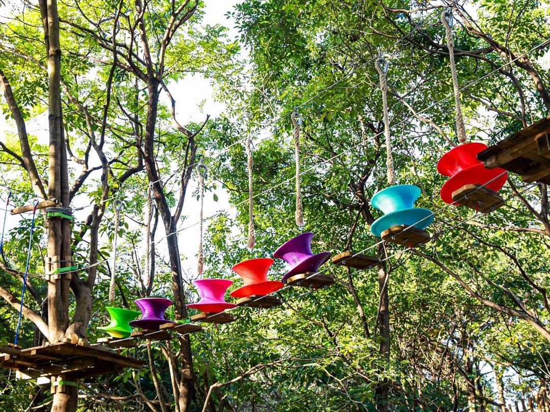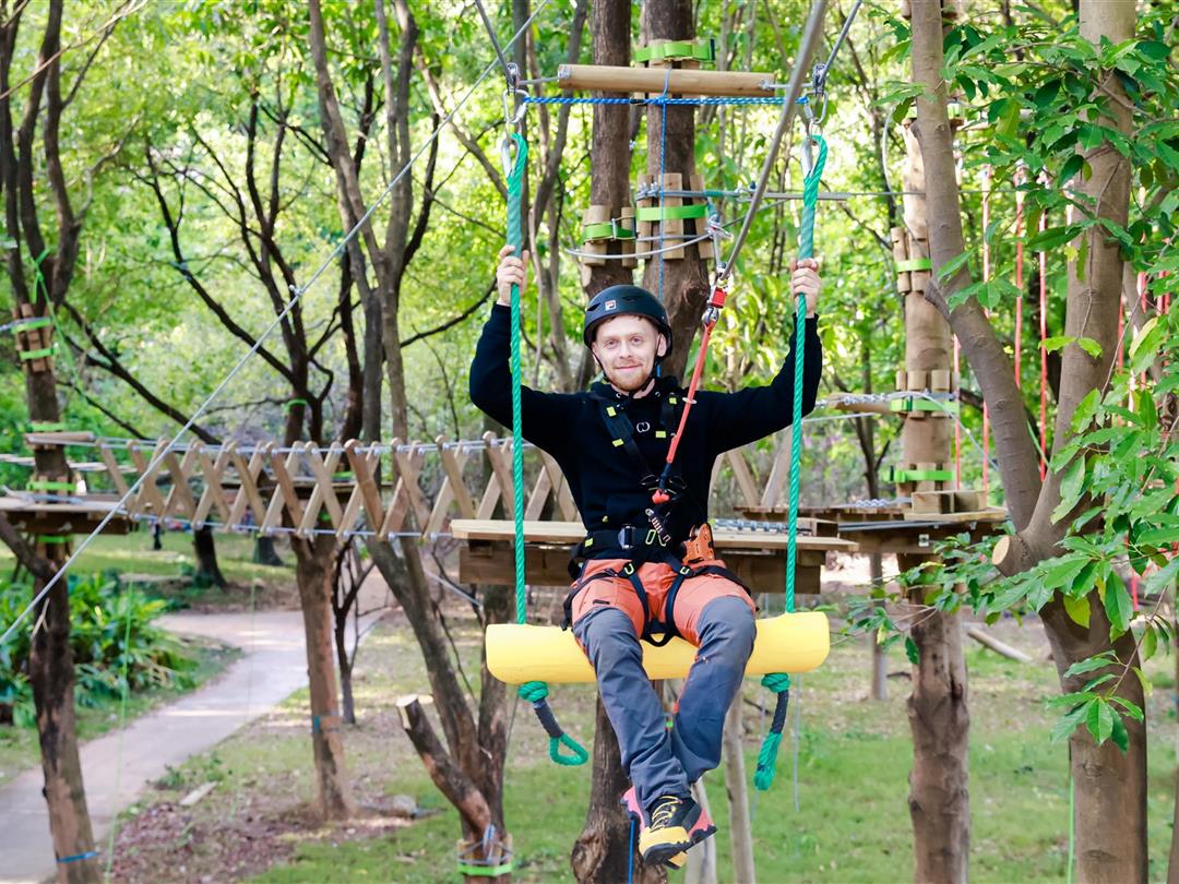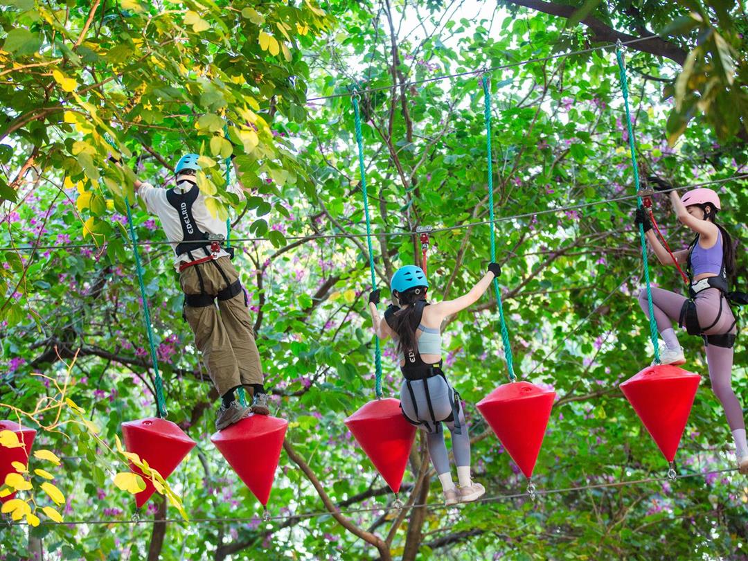 身高1.2米以上可体验,20个关卡难度适中,适配想尝试轻度挑战又不愿过度耗力的游客。标志性空中秋千让你悬浮于丛林之上,微风拂面间仿佛置身云端,悠哉享受空中漫步的惬意。