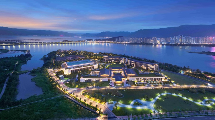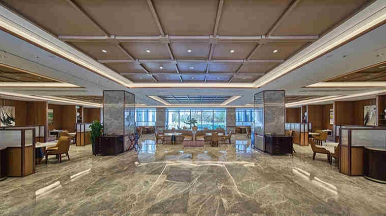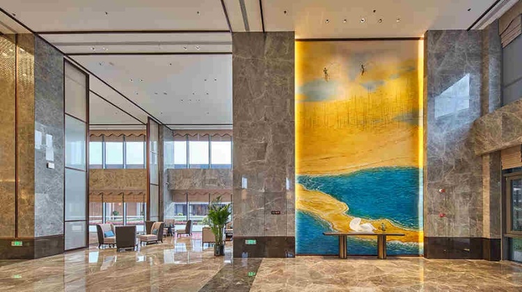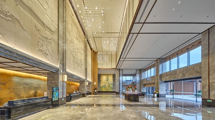 酒店占地面积七万多平方米,大堂挑高12米,以中国历史文化名镇霍童古镇为原型的浮雕高悬于顶,佐以青峰叠嶂、绿水隐现的青绿山水画和蓝黄相间的海岸写意图,让文学家郭沫若笔下“良港三都举世无,水深湾阔似天湖”的宁德跃然眼前,彰显了新中式风格恢宏大气的独特魅力。