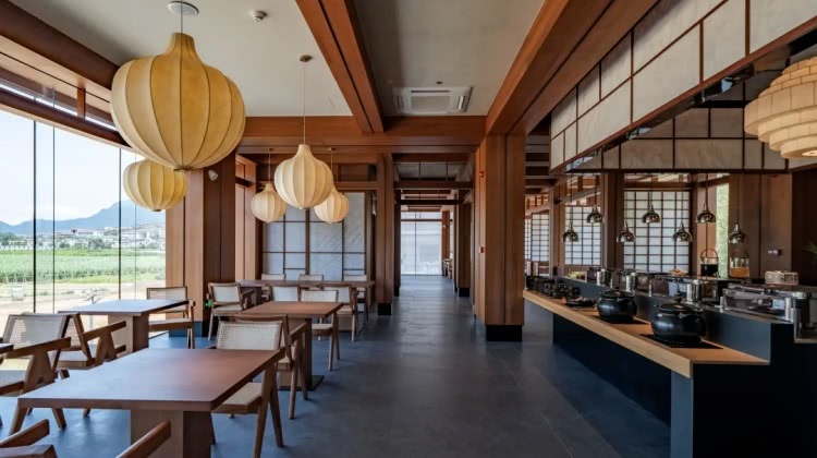 餐厅“南食召”可同时容纳60余人用餐,木质结构与灯笼光影营造静谧氛围,落地窗将远山田野引入室内,打造沉浸式自然体验。