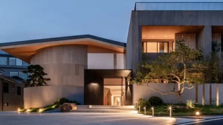 环形穹顶下,暖白灯带勾勒出粗犷石墙的肌理,光影交错间尽显原始与现代的碰撞,极简主义的仪式感,对称布局的接待台与修长灯柱形成视觉焦点,水磨石地面倒映天光,营造庄重而宁静的迎宾氛围。
