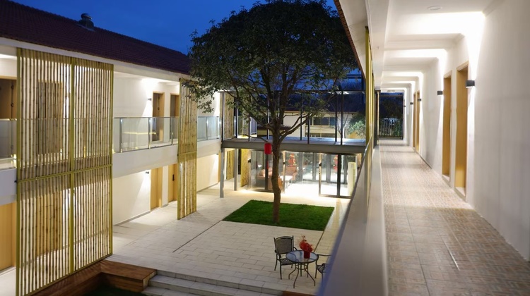 酒店的新中式风骨被温柔点亮。白墙、原木、竹影、通透的廊檐,在自然光下干净、清透、高级。抬眼是开阔的庭院景致,低头是光影交错的角落。