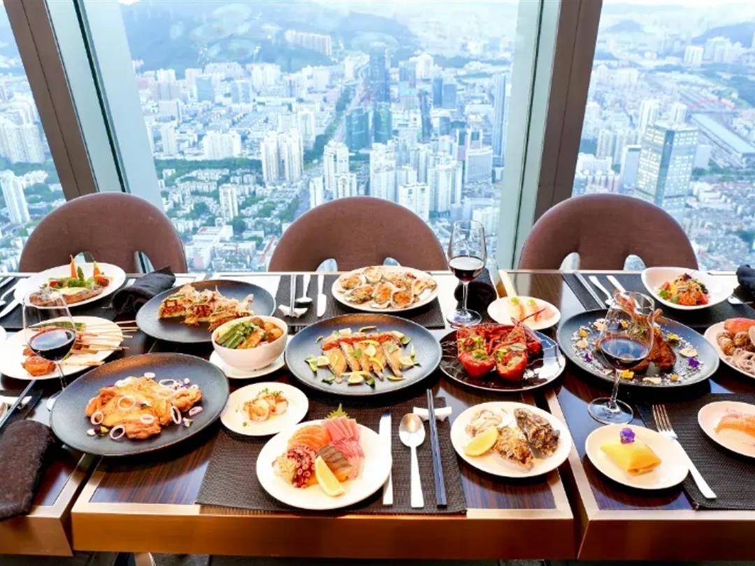 位于96层的酒店大堂,可将深圳繁华都市城景、唯美海湾日落与香港远山翠色尽收眼底,令宾客在静谧云端中与都市脉络紧密相连。三间餐厅和一间酒吧,以壮阔天际线为幕,致力于缔造非凡云端飨宴。