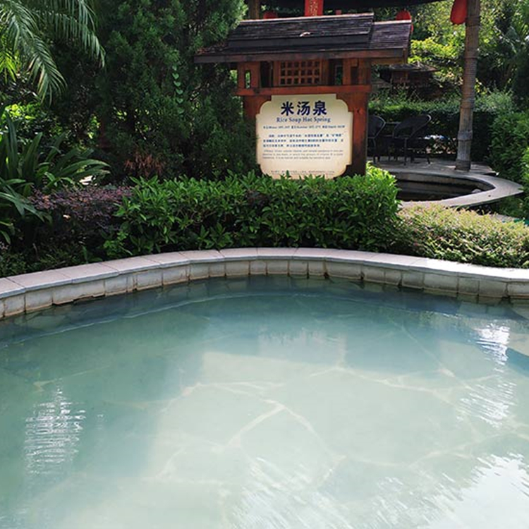 温泉结合了都市人的养生理念,精心打造了大型的客家围屋休闲区、别具特色的神秘神山溶洞区、造浪池、水疗SPA池、客家草药池、亲亲鱼疗池等等,整个池区分布在青山、翠竹环抱的自然美景之中,充分感受客家风情温泉的魅力。