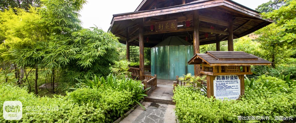 大型客家围屋休闲区,68个功能各异的温泉池,青山、翠竹环抱。